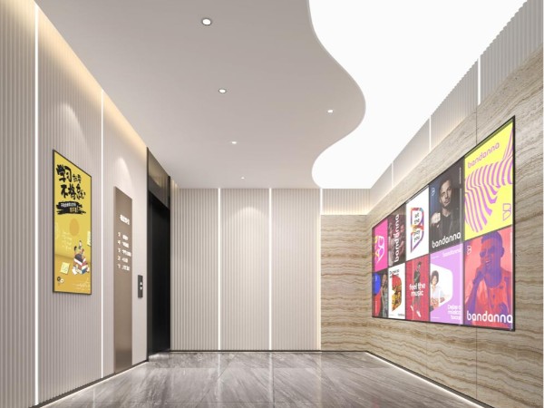 本案中的商場設(shè)計風格整體時尚前沿感比較強,專業(yè)裝修公司運用簡約而富有質(zhì)感的材質(zhì),既不會讓商場裝修整體的展示效果顯得過分張揚,也能給一個復(fù)合型的商業(yè)空間帶來年輕人感興趣的時尚前衛(wèi)精致的氛圍。頂層通過擺布不同線條走勢的吸頂燈帶,透露出足以提供正常照明的燈光光線豐富空間的層次感,地面大理石材質(zhì)的裝飾材料,柵格式墻面裝飾形態(tài),多元化的展示海報設(shè)計排版疏密有度,使人視覺上充滿著新鮮趣味性,避免顧客在等電梯時陷入視覺審美疲勞,增強空間的細節(jié)耐看程度。