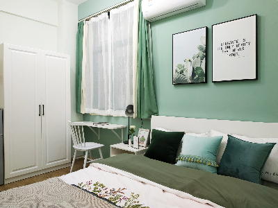 整個公寓以綠色為主色調,淡漠綠中注入一抹清新淡雅的灰豆綠,帶來一個極簡的生活美境,透著一股清新活潑的氣息,讓人仿佛置身于治愈系的綠色森林之中。樹枝形吊燈、金屬質感擺件、純白色家具等的使用,增添了空間的層次性和豐富感,讓居室更有藝術的氣息。 深圳公寓裝修公司